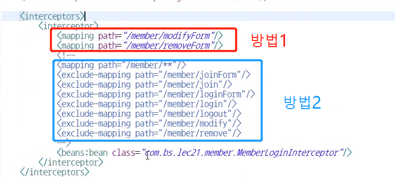 방법1은 인터셉터할 경로를 지정해주는 거고, 방법2는 인터셉터를 제외할 경로를 지정해주는 방법이다.