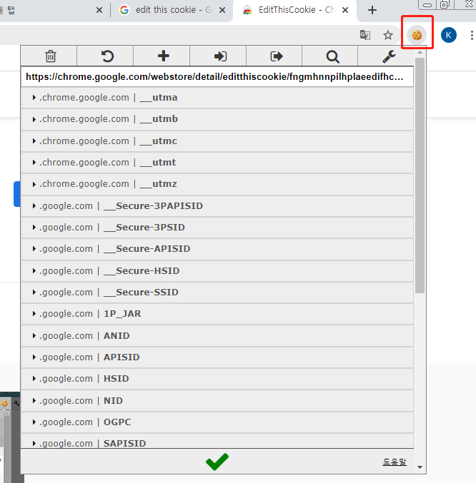 이 프로그램을 깔면 아래처럼 크롬브라우저 우측상단에 쿠키 아이콘이 생기고